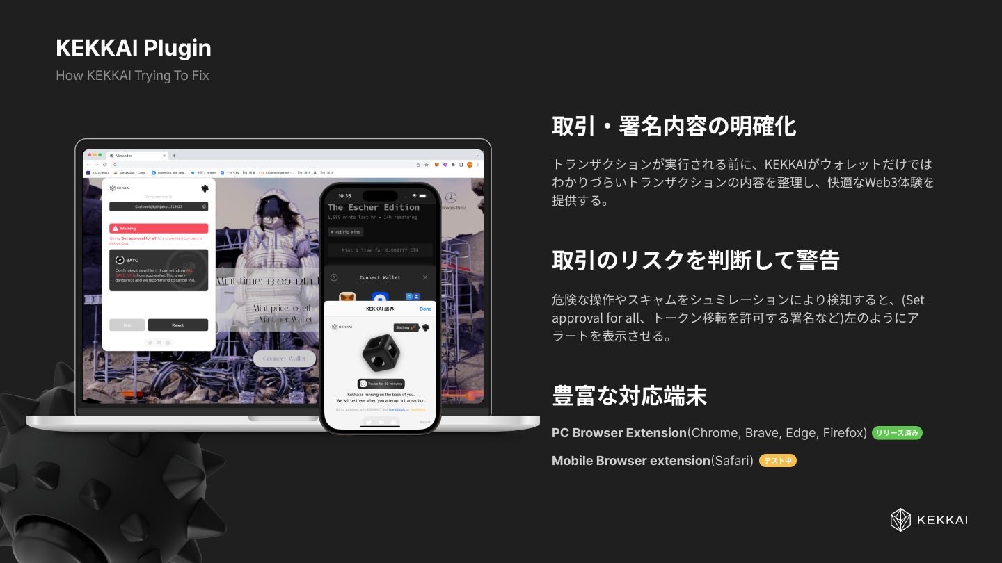 株式会社KEKKAI は、2023年に設立のWeb3領域におけるセキュリティ会社です。 現在は、トランザクションのシュミレーション分析により危険検知ができるWeb3セキュリティプラグイン「KEKKAI」や、NFT詐欺検出・取引シュミレーションができるAPIサービスをリリースしています。