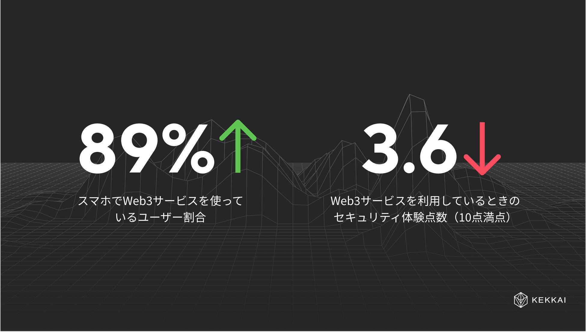 4月に行ったKEKKAI独自のユーザ調査では、およそ9割の人がスマホでWeb3サービスを利用したことがある一方で、スマホでのWeb3セキュリティ満足度は10点満点中3.6点という結果が出ています。