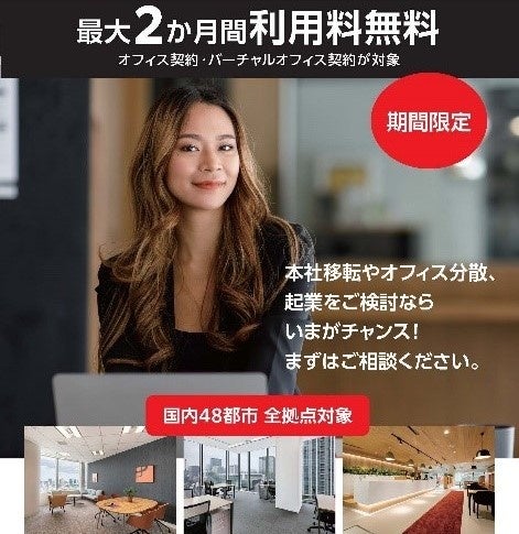 リージャスでは12月1日より期間限定で、国内48都市にある全拠点を対象に、オフィス契約・バーチャルオフィス契約の利用料が最大2か月間無料になるキャンペーンを行っております。