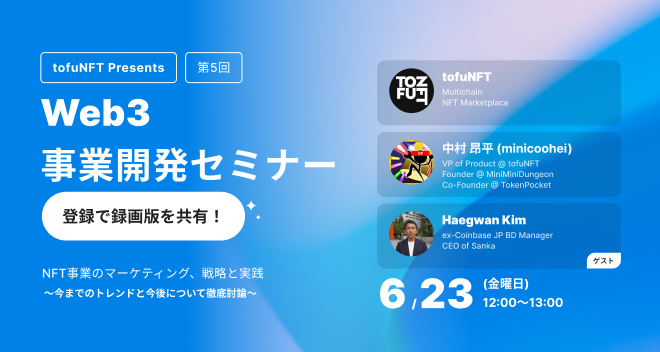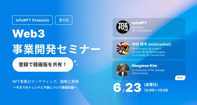 web3マーケティングソリューション「Sanka」を提供する株式会社サンカ(本社:東京都江東区、代表取締役:金海寛 | キム ヘガン、以下Sanka)は、世界最大級のNFTマーケットプレイスtofuNFTと共催で、「web3事業開発セミナー」を行うことを発表しました。
