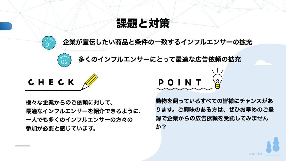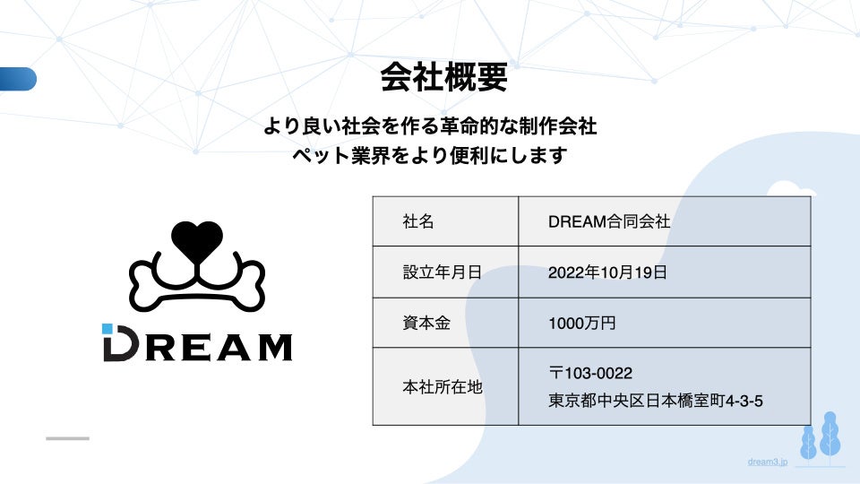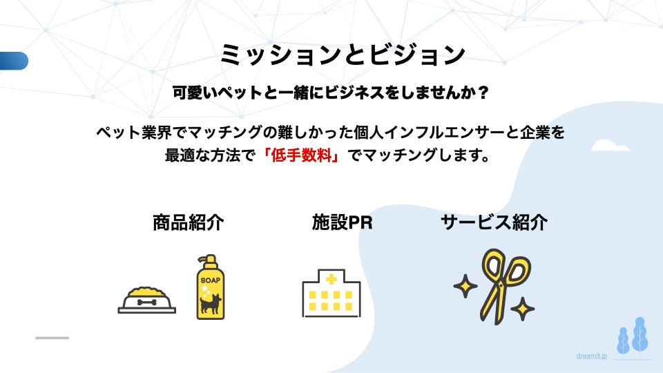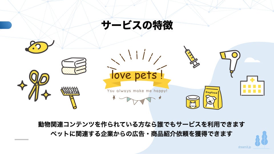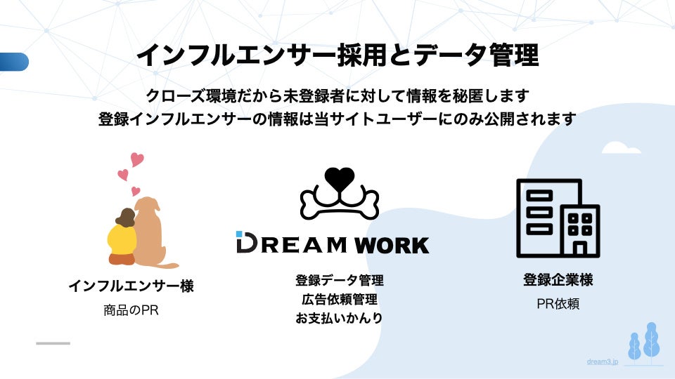 事業内容:ペットインフルエンサーマッチングプラットフォーム「Dream Work」の運営