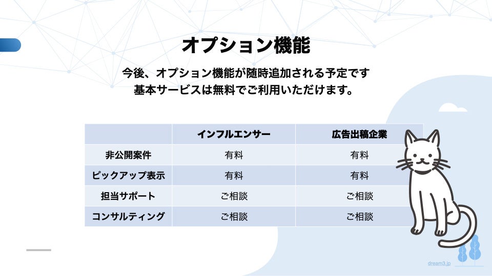 無料利用: 登録費用や月額などの固定費は不要で、インフルエンサーの方々に無料でご利用いただけます。