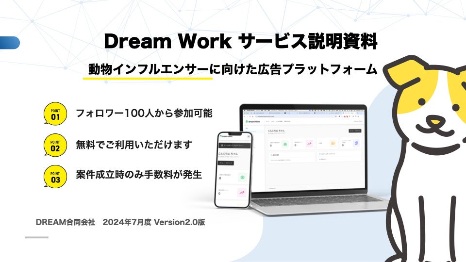 DREAM合同会社(本社:東京都中央区)は、本日8月30日、ペットインフルエンサーと広告企業をマッチングするオンラインプラットフォーム「Dream Work」(https://work.dream3.jp/lp-c/?r=p)の8月公式リリースに向けたプレオープンを発表いたしました。
