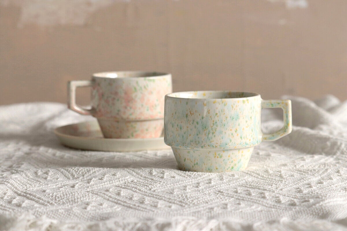 2柄ともに色の異なる釉薬を手作業で吹き付ける工法で制作しており、一つとして同じ柄のものはありません。ぜひお手に取って、お気に入りの模様を見つてけてみてください。