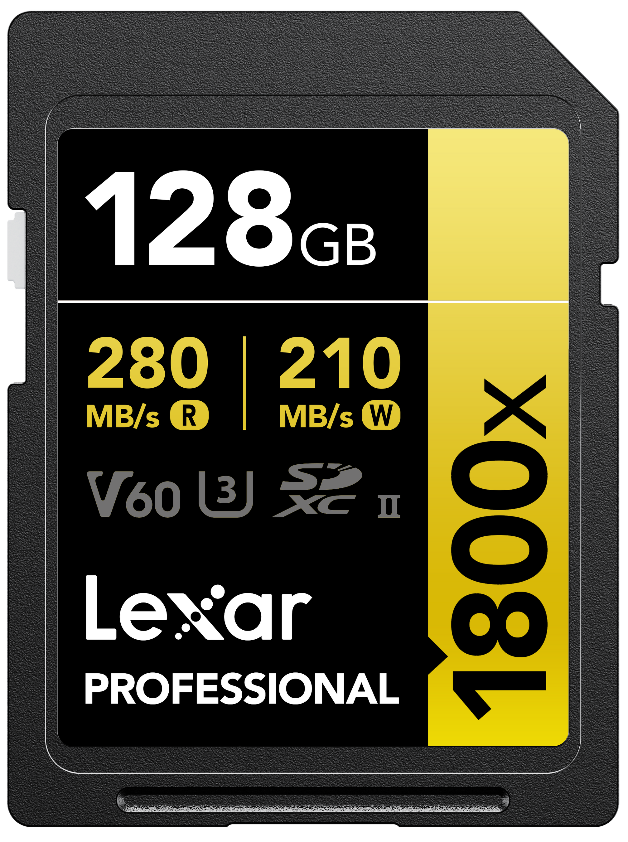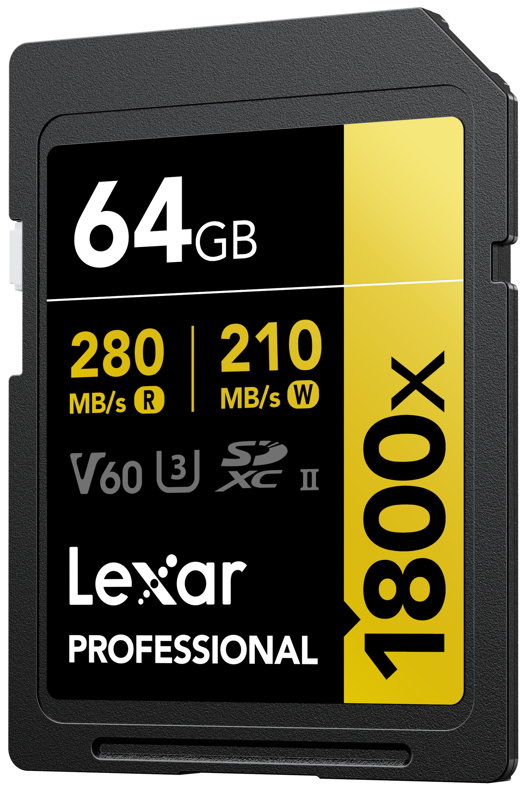 Lexar Professional 1800x SDXC UHS-IIカードGOLDシリーズの新製品(64GB、128GB、256GB)は、Lexar独自のハードウェアとファームウェア開発により、従来モデルから速度改善を実現、最大読み出し速度280MB/s、最大書き込み210MB/s(64GB、128GB)、もしくは205MB/s(256GB)という高速性能(*1)により、撮影から撮影後のワークフローに至るあらゆる使用シーンにおいて、最高のパフォーマンスを発揮します。