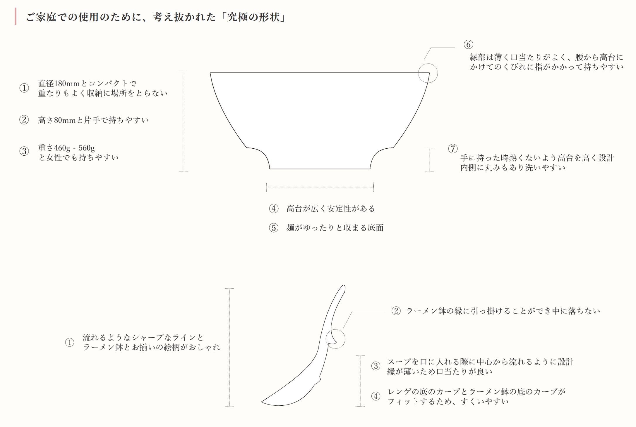 「家庭でインスタントラーメンをおいしく食べるための器」をコンセプトに、試行錯誤を重ね、苦難の末に完成したまさに「究極の」フォルム。