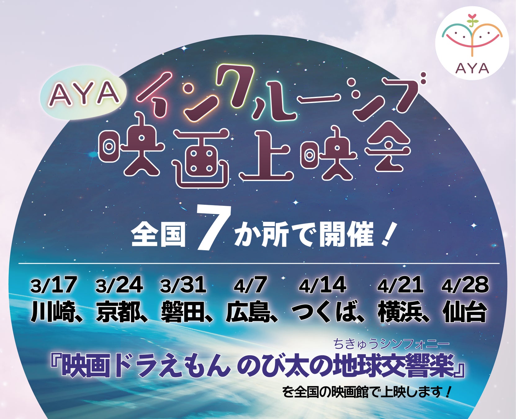 2024年の目標は、映画館との連携を全国に拡大し、より多くの障がい児・医療的ケア児とご家族に映画鑑賞を楽しんでもらうこと。第一弾として、3月17日より『映画ドラえもんのび太の地球交響楽(ちきゅうシンフォニー)』の貸切上映会イベント~AYAインクルーシブ映画上映会~をスタートしました。本イベントは、4月28日まで、神奈川・京都・静岡・広島・茨城・宮城など全国7か所での開催を予定しています。