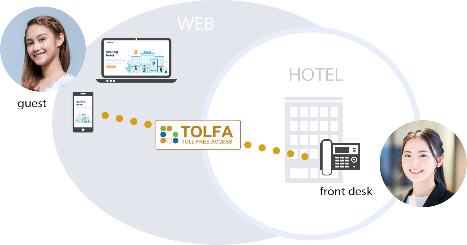 無料通話「TOLFA」にホテル・旅館などの宿泊施設向けオプションが追加されます(2024年5月販売開始予定)。WEBサイトからの問い合わせだけでなく、宿泊施設の客室内線のかわりとしてもTOLFAのご利用をいただくことができます。WEBからの通話は、既存の宿泊施設の電話設備へ着信させることができます。