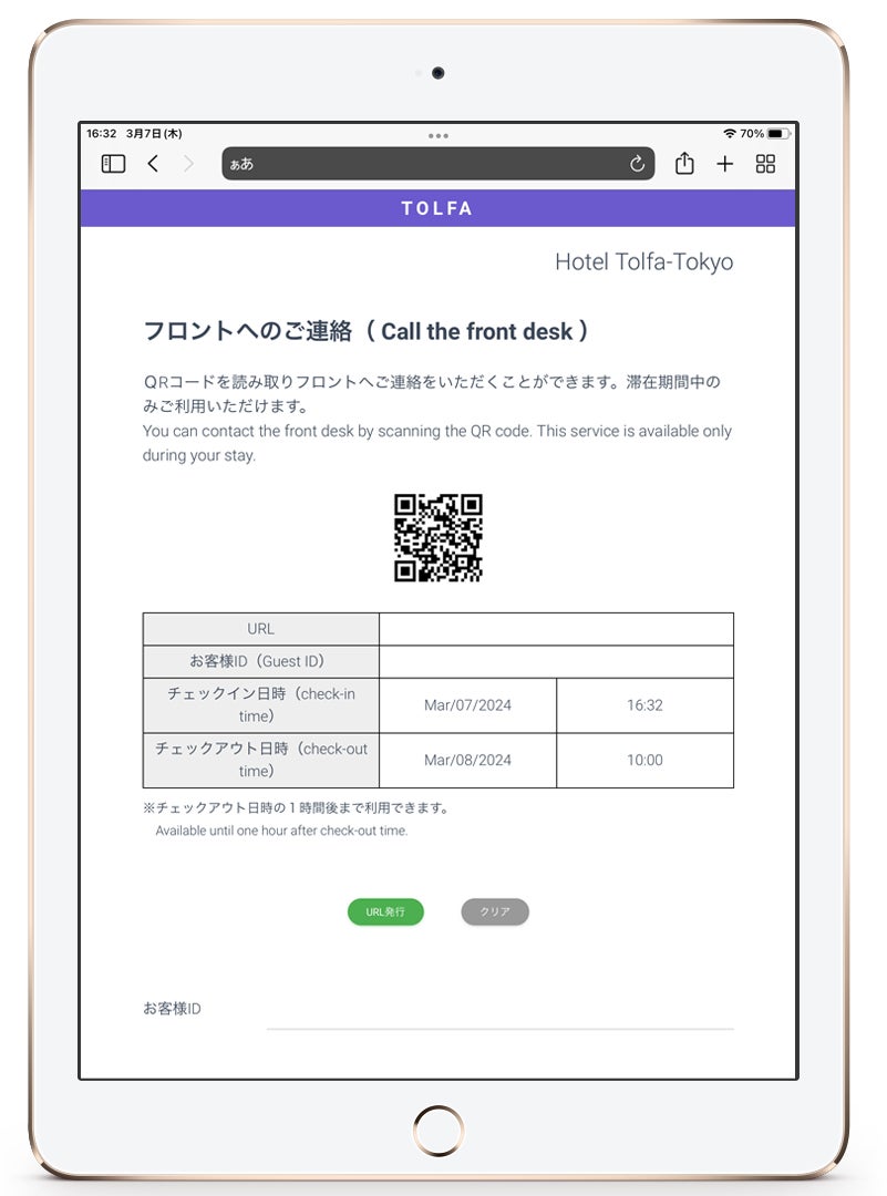 チェックインの際、滞在期間中だけ利用できるワンタイムのURLを発行するユーザーインターフェイスをご提供いたします。ゲストのモバイルでQRコードを読み取っていたく、 またはQRコードを印刷して発行することで、「滞在期間中だけ利用できる連絡手段」を提供できるようになります。 ゲストのIDや客室番号の情報を登録してURLを発行することで、フロントでの応答時にゲストを識別することができるようになります。