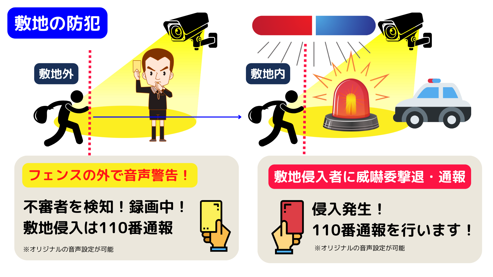 具体的には、フェンス外からの不審者への音声警告や、即座の110番通報などを行います。