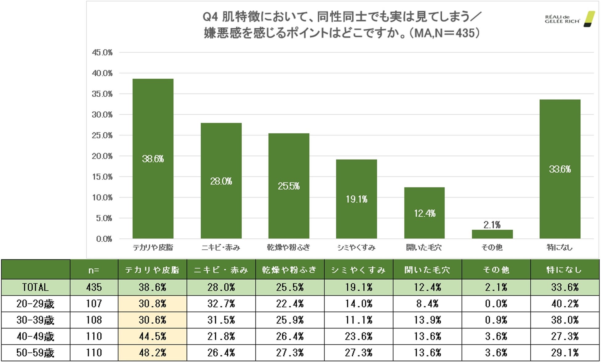「特に手入れされていると好印象な肌状態を教えてください。」という質問をしたところ、一番多く挙げられた肌状態は「テカリや皮脂」で、約4割(35.2%)という結果に。「テカリや皮脂」はどの年代においても手入れされていると好印象な肌状態ということが分かりました。続いて、「自身の肌で気になっている点はありますか。お悩みを教えてください。」と質問したところ、Q5同様に1番多かったのは、「テカリや皮脂」という結果に。また、悩みを持つ人は、20-30代よりも40-50代に多くなる傾向にありました。Q5、Q6を通して、他人の肌、自身の肌ともに「テカリや皮脂」を気にしている男性が多いということが分かります。(N=435)
