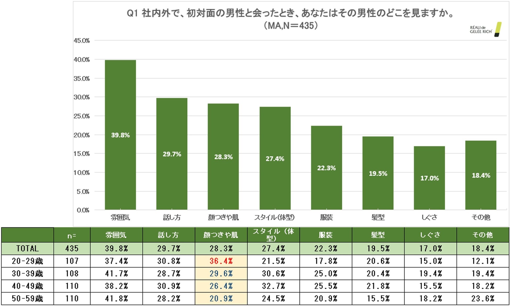 ① 初対面の男性と会ったときに見るポイントとして、20代は「雰囲気」に次いで「顔つきや肌」を重視する男性が約4割という結果に。自身が気にしていないだけで、部下は上司の「顔つきや肌」を見ている可能性も。