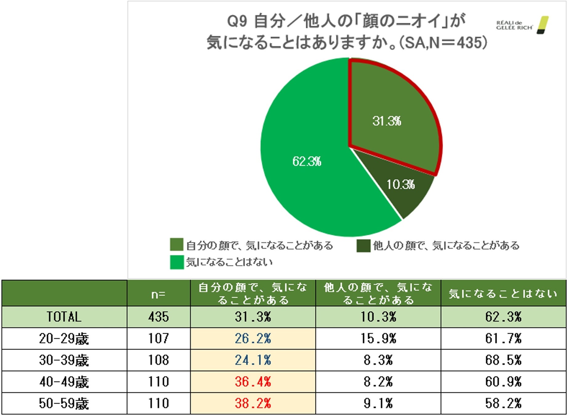 「自分/他人の「顔のニオイ」が気になることはありますか。」と質問したところ、約3割(31.3%)が「自分の顔で、気になることがある」と回答しました。また、年代が上がるにつれて顔のニオイを気にする男性は多くなる傾向に。顔のニオイは、「テカリや皮脂」が原因となることも多く、Q6の結果「年齢が上がるにつれて「テカリや皮脂」を気にする男性が多い」との関連性もうかがえます。(N=435)