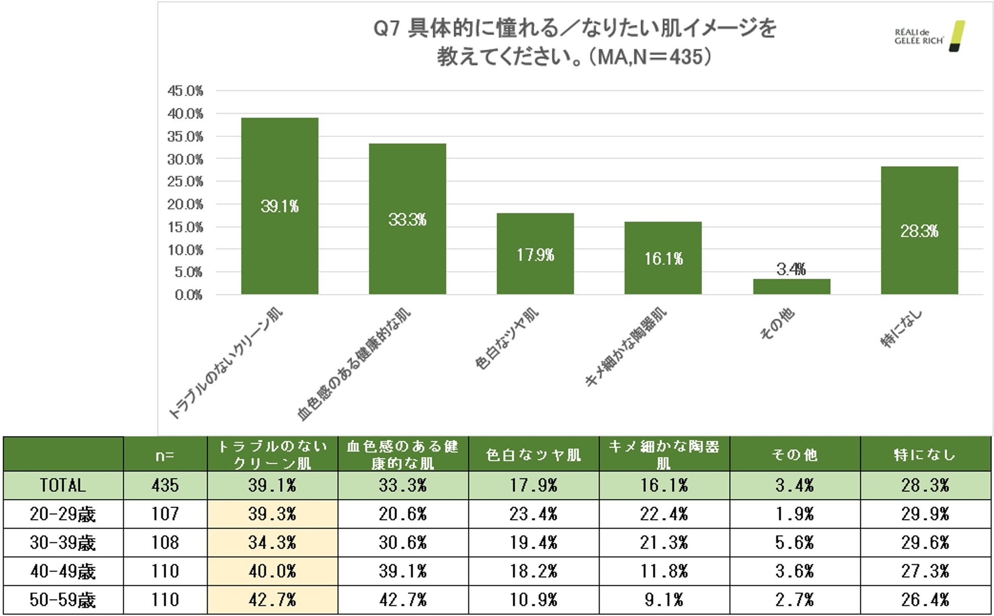 「具体的に憧れる/なりたい肌イメージを教えてください。」と質問したところ、全年代で「トラブルのないクリーン肌」がトップという結果になりました。「色白なツヤ肌」「キメ細やかな陶器肌」といった“+α”な高みを目指すより、“マイナスをゼロに戻す”ような、自身の肌悩みの解消を目指す人が多いということが推測されます。 (N= 435)