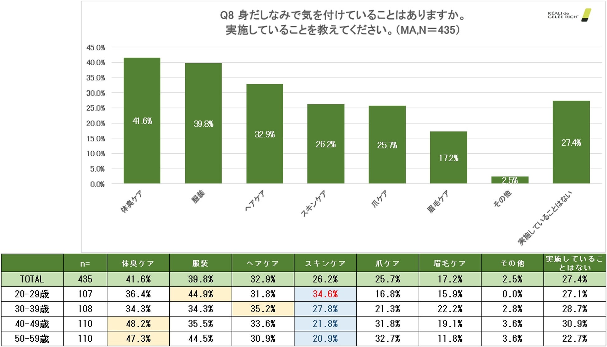 「身だしなみで気を付けていることはありますか。実施していることを教えてください。」という質問をしたところ、「体臭ケア」が1位で約4割(41.6%)、次いで「服装」「ヘアケア」「スキンケア」という順位になりました。 中でも4位の「スキンケア」は、年齢が上がるにつれて実践している男性は少ないということが分かりました。(N=435)