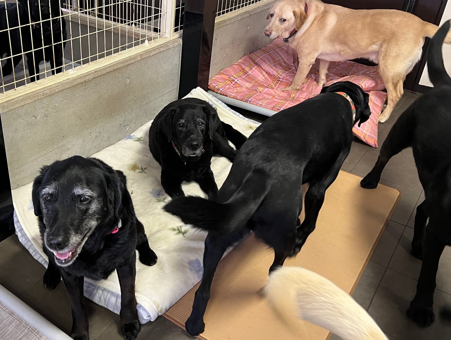 隣の施設に避難中の老犬たち