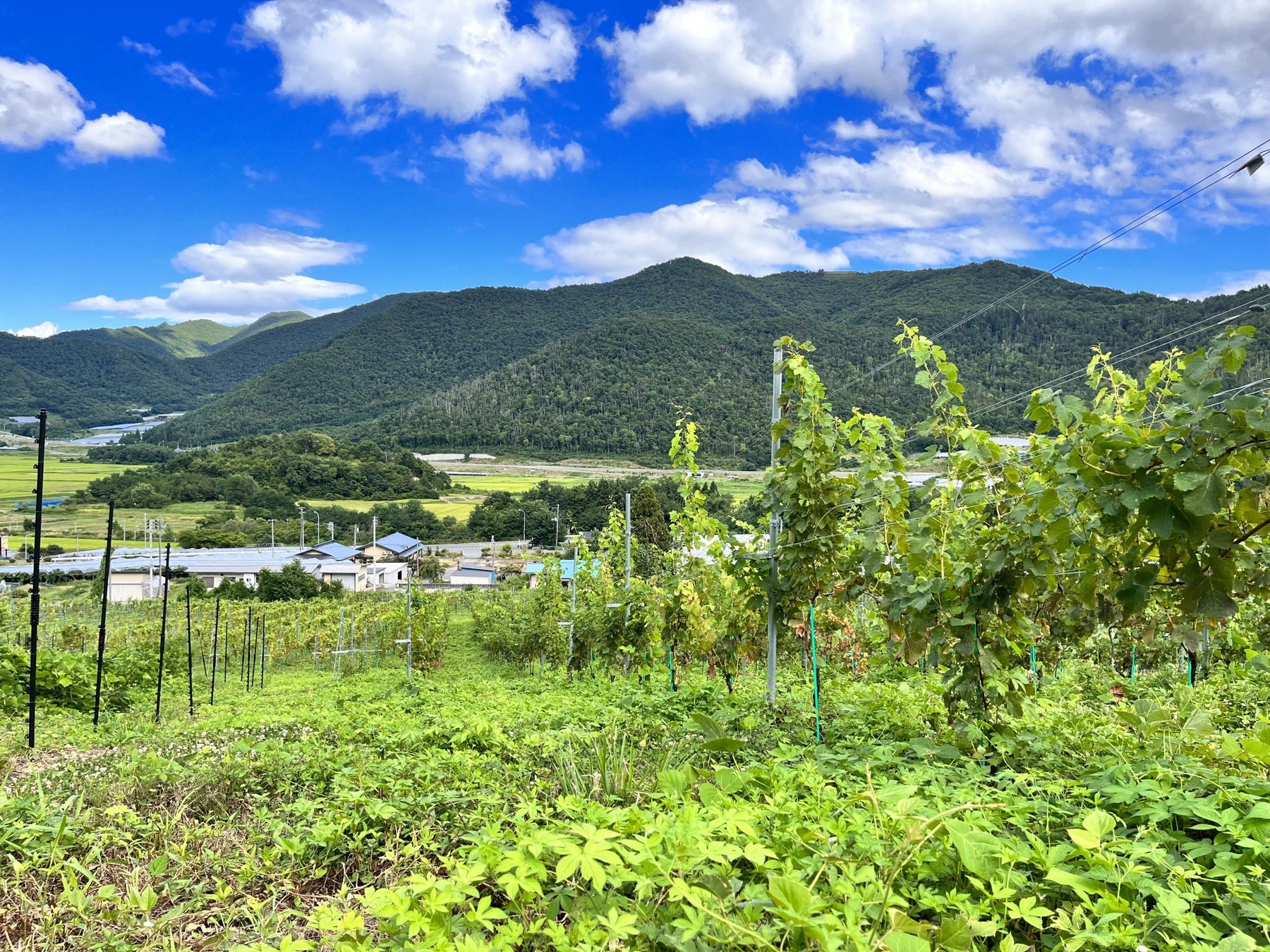 醸造所を構え、周辺には自社農園が広がる南陽市の新田地区は、古くからデラウェアなどの食用ブドウの栽培が盛んな場所でした。新田のブドウ畑がある十分一山の山裾は、大きな石や小石が多い土質で水はけが良く、ブドウの生育に適しています。さらに山を駆けあがる上昇気流によって風通しもよいため、病気にもなりにくくブドウ栽培に有利な環境でもあります。