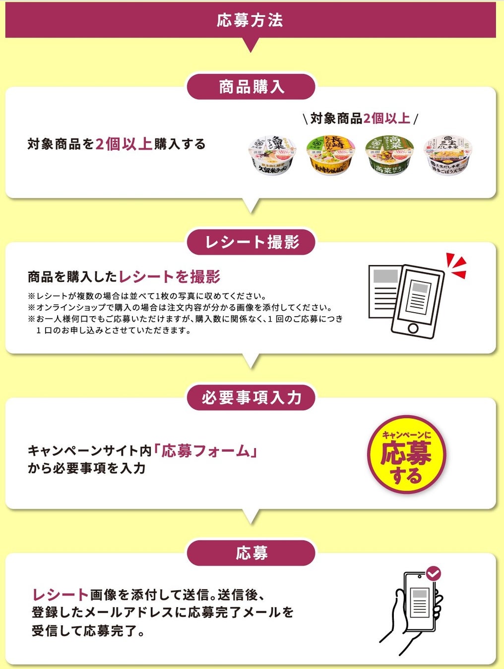 「九州三宝堂 久留米ラーメン」「九州三宝堂 高菜博多ラーメン」「九州三宝堂 長崎ちゃんぽん」「三宝だし本家 博多ごぼう天うどん」のうち、2個以上お買い上げのレシートを撮影し、キャンペーンサイトからご応募。