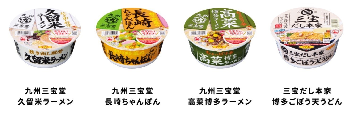 対象商品は、「九州三宝堂 久留米ラーメン」「九州三宝堂 高菜博多ラーメン」「九州三宝堂 長崎ちゃんぽん」「三宝だし本家 博多ごぼう天うどん」の4商品。