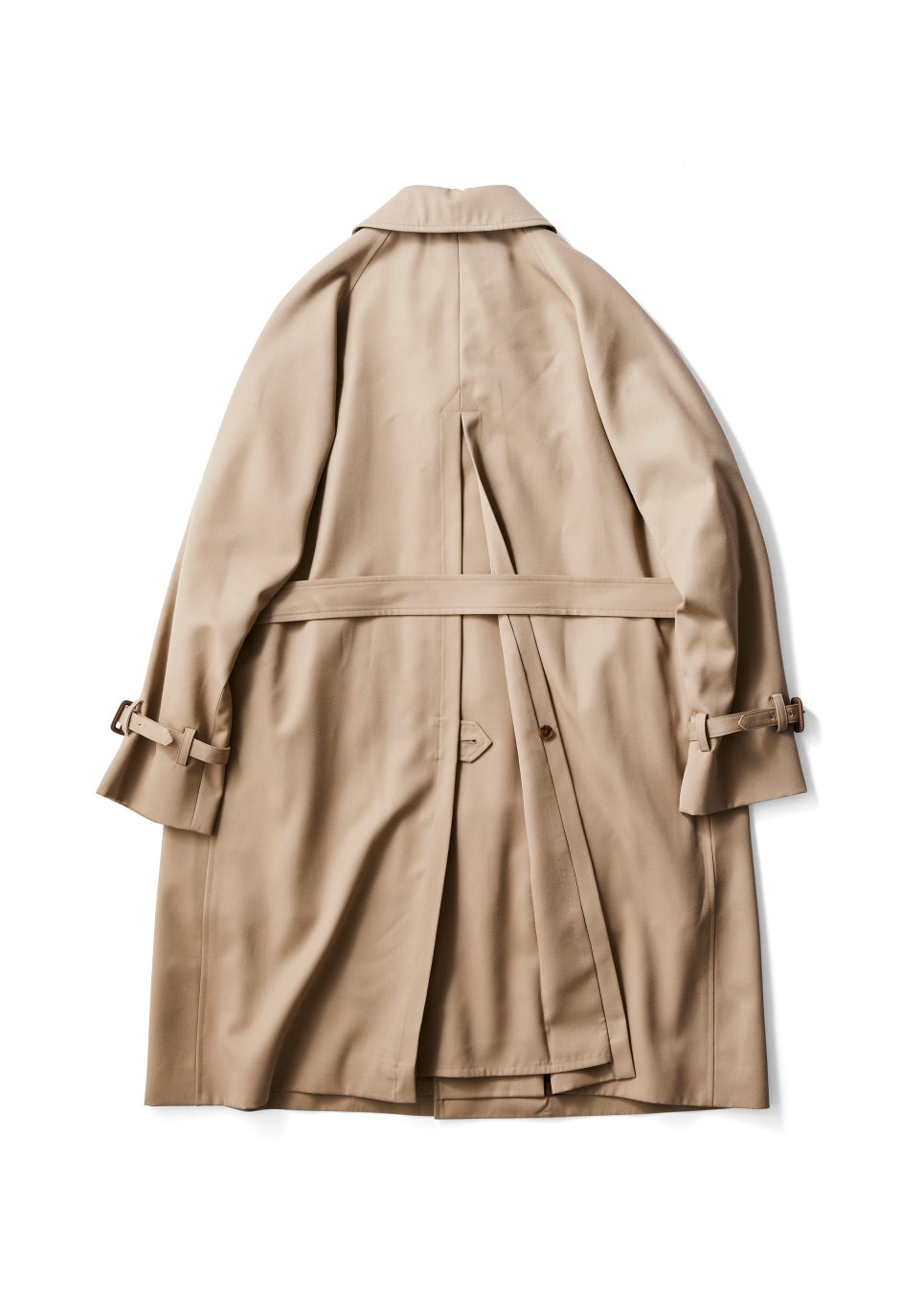 新モデルとして加わったNEW トレンチ。洋服好きには堪らない⼀枚袖のラグランスリーブに加えて、バックスタイルは深めに⼊ったインバーテッドプリーツにベルテッド仕様とヴィンテージコートにあるディテールをふんだんに落とし込みました。ロング丈A ラインでゆったりとしたシルエットは、休⽇スタイルも格上げします。