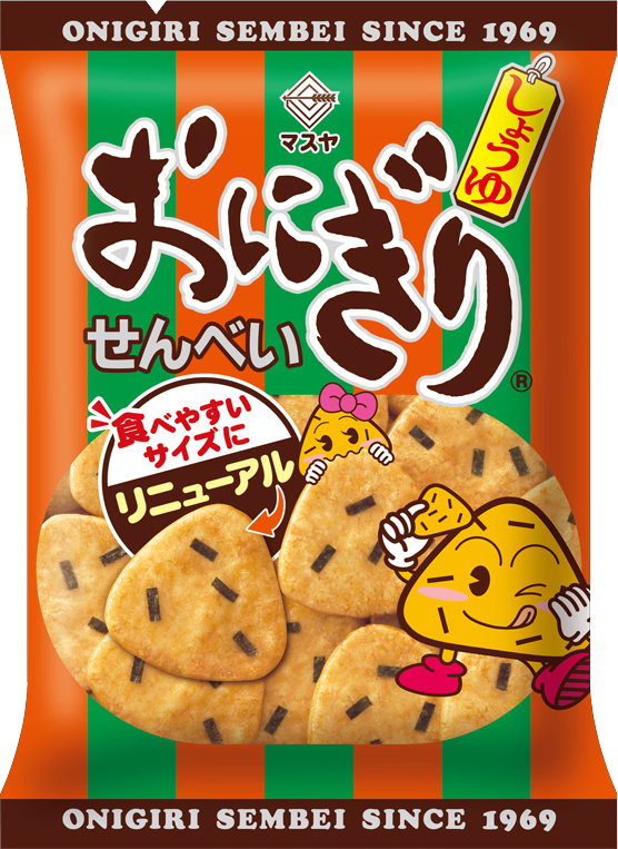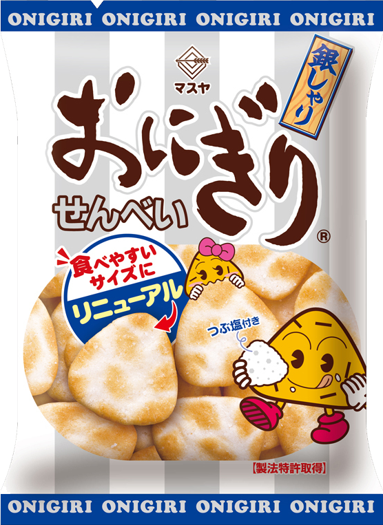 1969年に誕生したおにぎりの形の三角形をかたどった、ソフトな食感のおせんべいです。ふっくらサクサクのお米の生地に「だし」のうまみにこだわった甘辛のしょうゆダレで味付けし、風味豊かな焼き海苔が振りかけられております。また、昨年発売10周年を迎えた『おにぎりせんべい 銀しゃり』は大きさの異なるつぶ塩がお米の旨味を引き立てる味わいでこちらも大人気商品です。