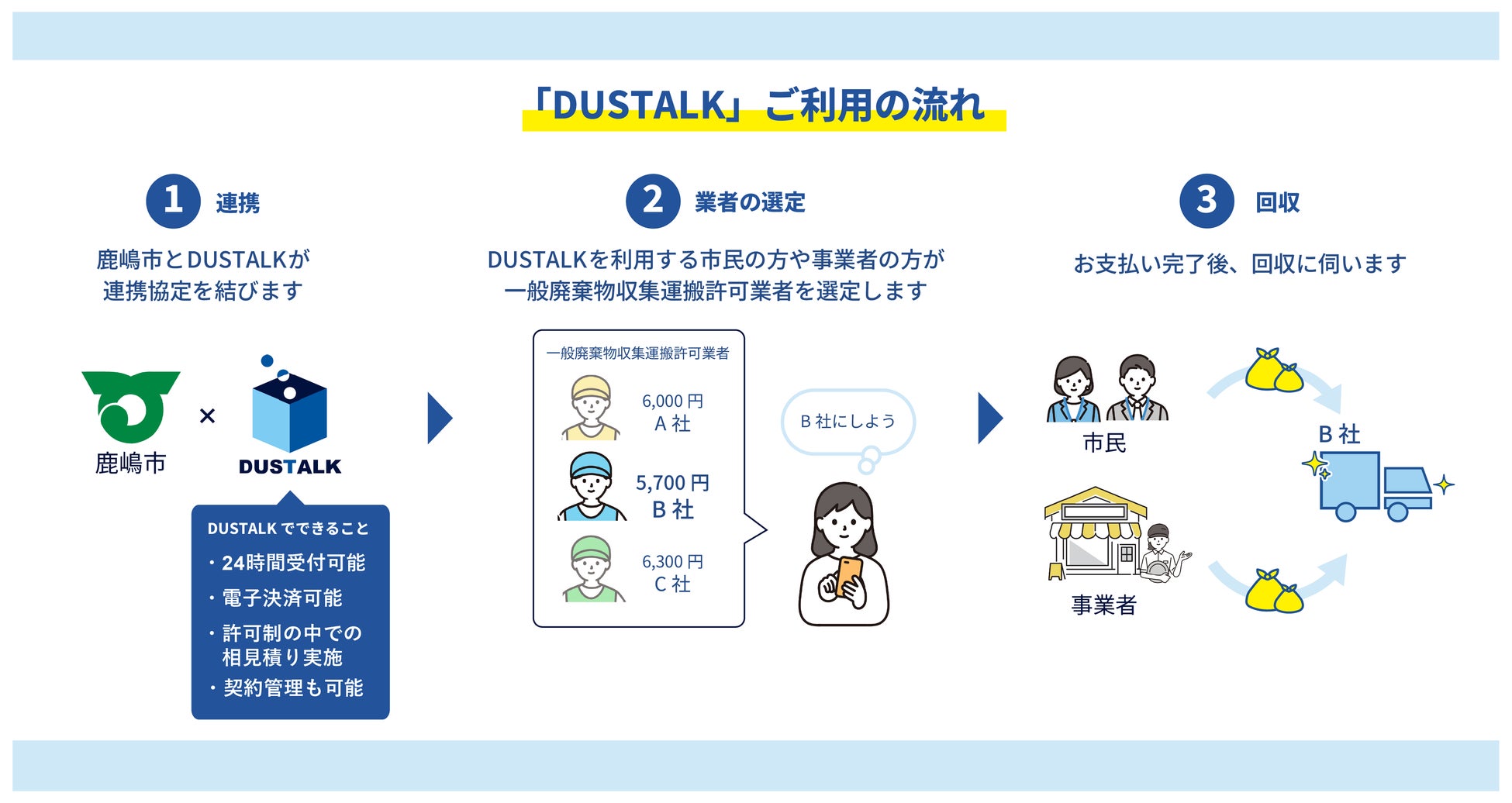 「ダストーク」と自治体との連携は今回が初めてとなります。今後、鹿嶋市との協定を通じて、本モデルを他の自治体にも展開し、全国の一般廃棄物収集運搬・処理の効率化と環境負荷の低減に貢献してまいります。