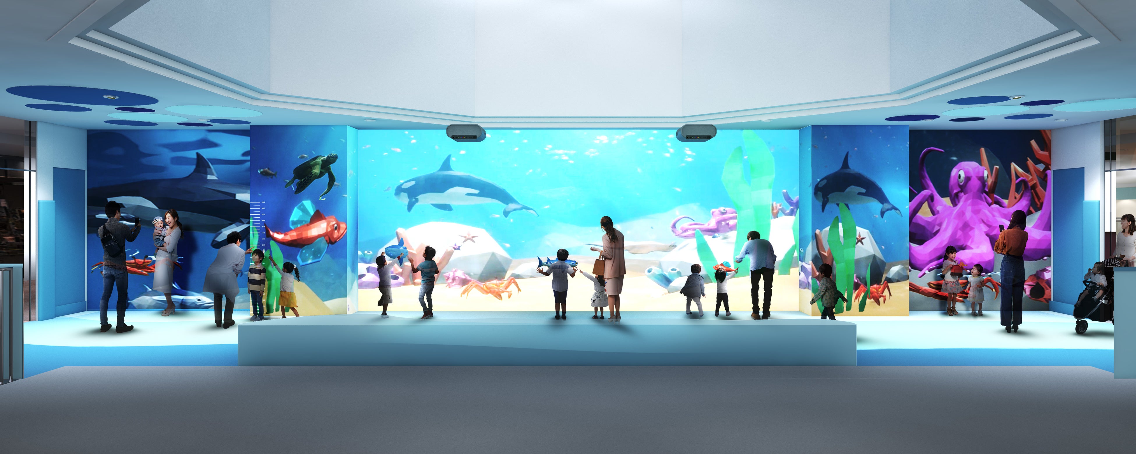 「まなびのうみ」では、壁面に神戸の風景や海辺をイメージしたCGで、海の中を演出。センサーの前で手を