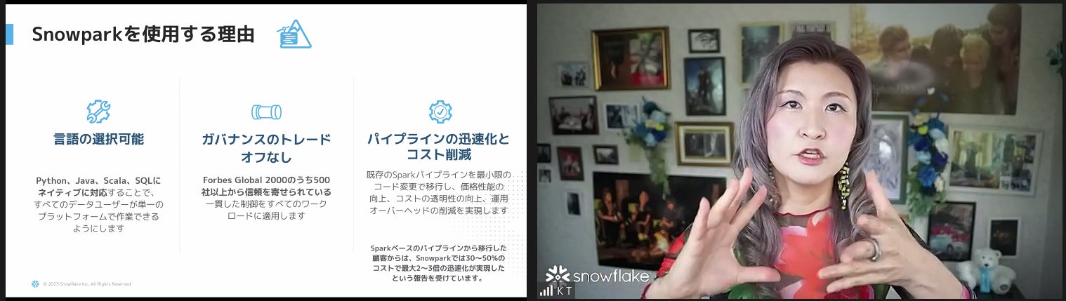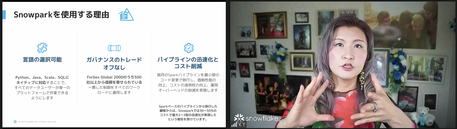 KTは、データエンジニアリングの課題として①サイロ化した多様なデータ、②パイプラインの信頼性と性能、③管理と維持の難しさを挙げた上で、解決策の1つとしてSnowparkを紹介しました。KTは、特に言語が複数選択できる点やパイプラインの迅速化とコスト削減に貢献する点、セキュリティとガバナンスが確立されている点を強調しました。また、「Snowflakeのワンプラットフォーム上で素早く処理できることで、さまざまなメリットが創出される。Snowparkにより仕事の創造性、クリエイティビティが活性化するフローが生まれれば」と期待を込めました。