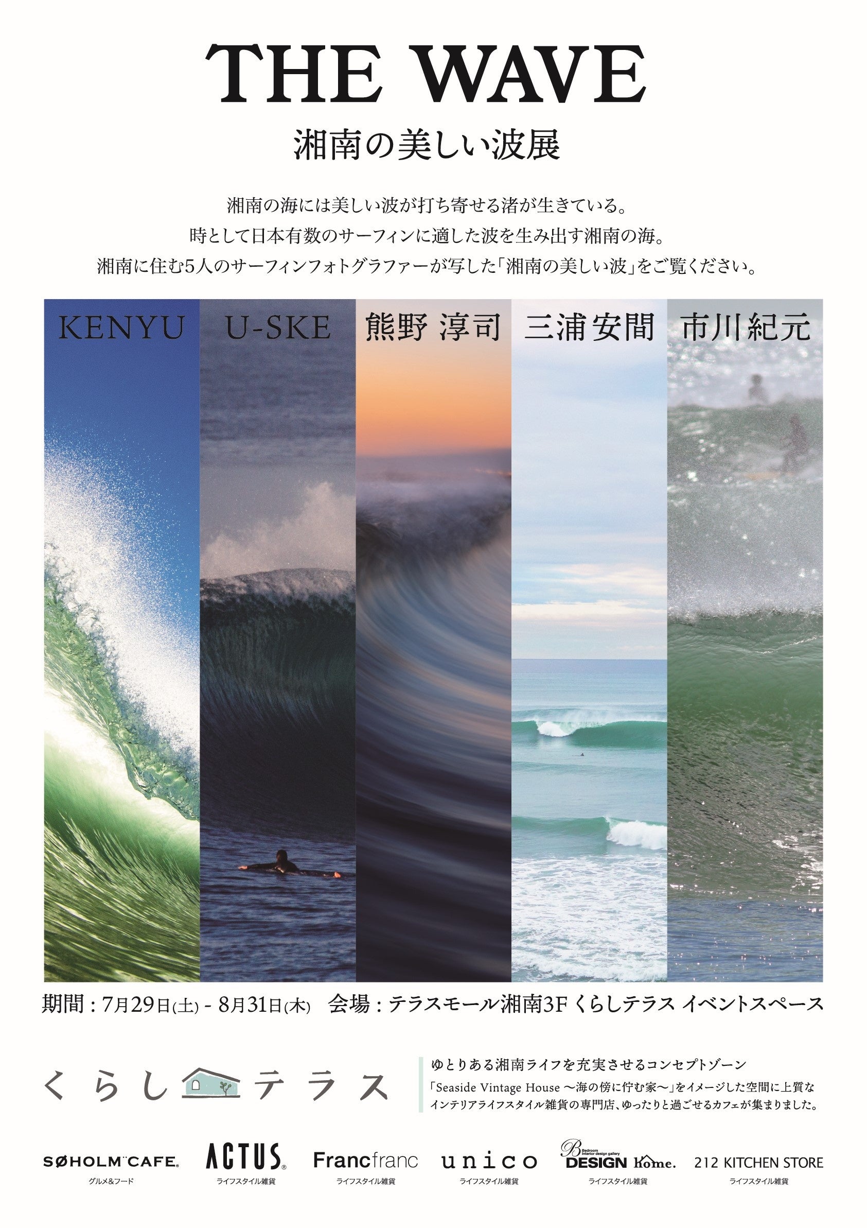 湘南の暮らしをテーマにする「くらしテラス」では、湘南を代表する5人の写真家による写真展を開催しています。展示のテーマは「美しい波」。決して夏と切り離すことのできない “海”の、波の様子や風景、光など、写真家の手によってとらえられた美しい瞬間が並びます。