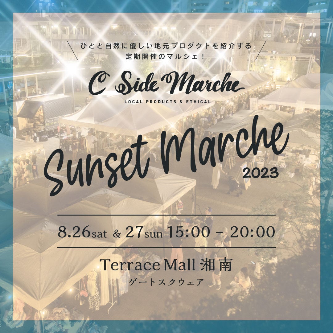 湘南・西湘エリアの地域に根差したエシカルでローカルなプロダクトが多数参加し、人や地球への優しさを伝えるマルシェとして定期的に開催している「C Side Marche(シーサイドマルシェ)」。8月は「Sunset Marche(サンセットマルシェ)」と題し、日が長い夏の季節に合わせて、通常のマルシェでは11時~17時開催のところ、時間帯を遅くした15時~20時で開催します。いつもとは異なる、夏ならではの夕方から夜にかけてのマルシェでのひとときを、存分にお楽しみください。