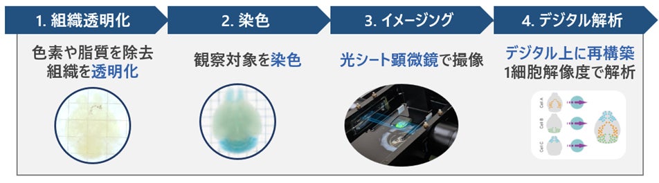 「CUBIC法」は、臓器や組織サンプルの脱脂・脱色、および屈折率調整を行い、サンプルを透明化することで知られています。この透明化したサンプルに対して免疫染色を施し、ライトシート顕微鏡で撮影することにより、高解像度の3次元イメージングを実現しています。