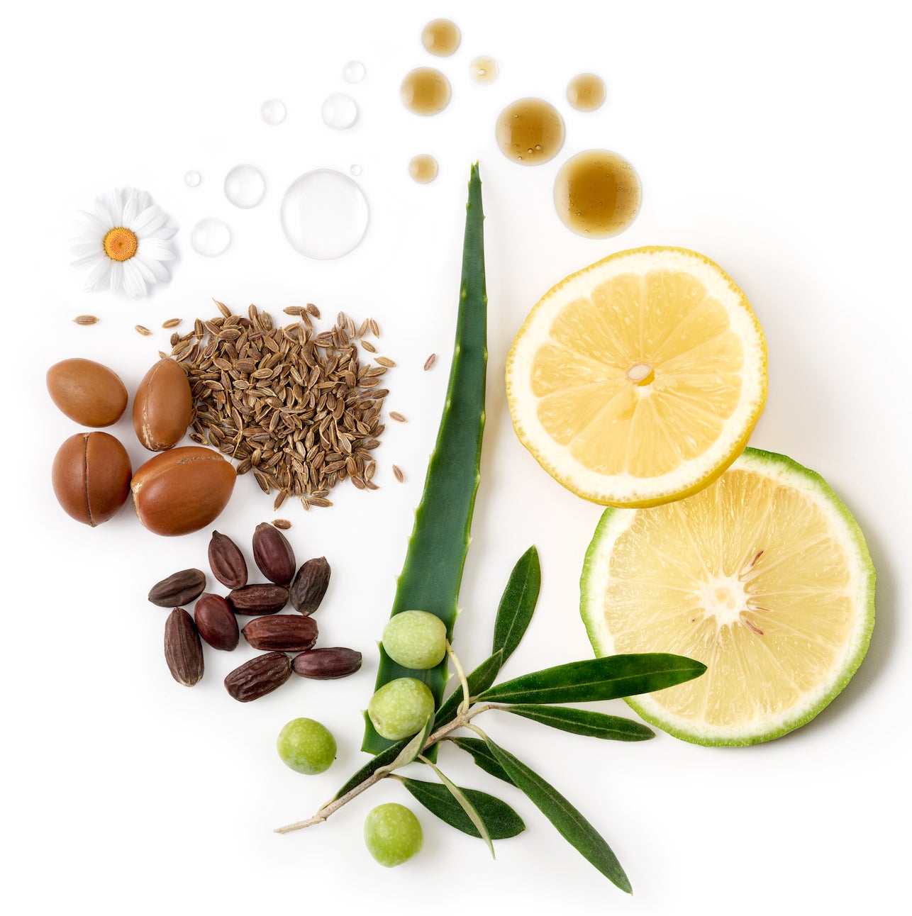 レモン果皮オイル、オリーブ果実オイル、ベルガモット果実オイル、ディルシードエキス、ホホバ種子オイル、アルガンオイル、アロエベラエキス、カミツレフラワーエキス