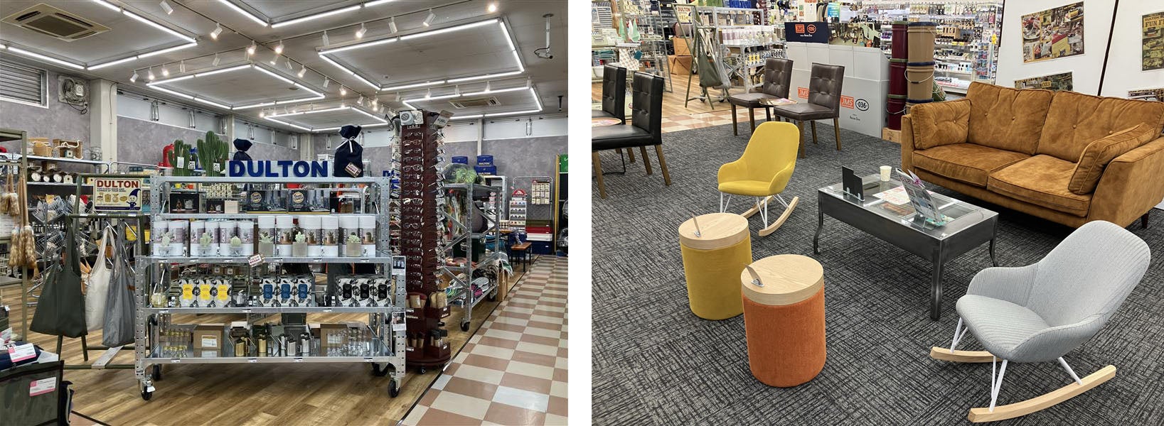 また、ジェームス谷和原インター店では23年8月より、生活にまつわるあらゆる「モノ」を提供するDULTONの数ある商品群の中から車・ガレージ・アウトドア関連用品やインテリア雑貨など約800アイテムを豊富に取り揃えた売場を設けるとともに、DULTONのソファ・チェアなどを配置したお客様休憩スペースで実際に商品を体験・体感いただけるようにしています。