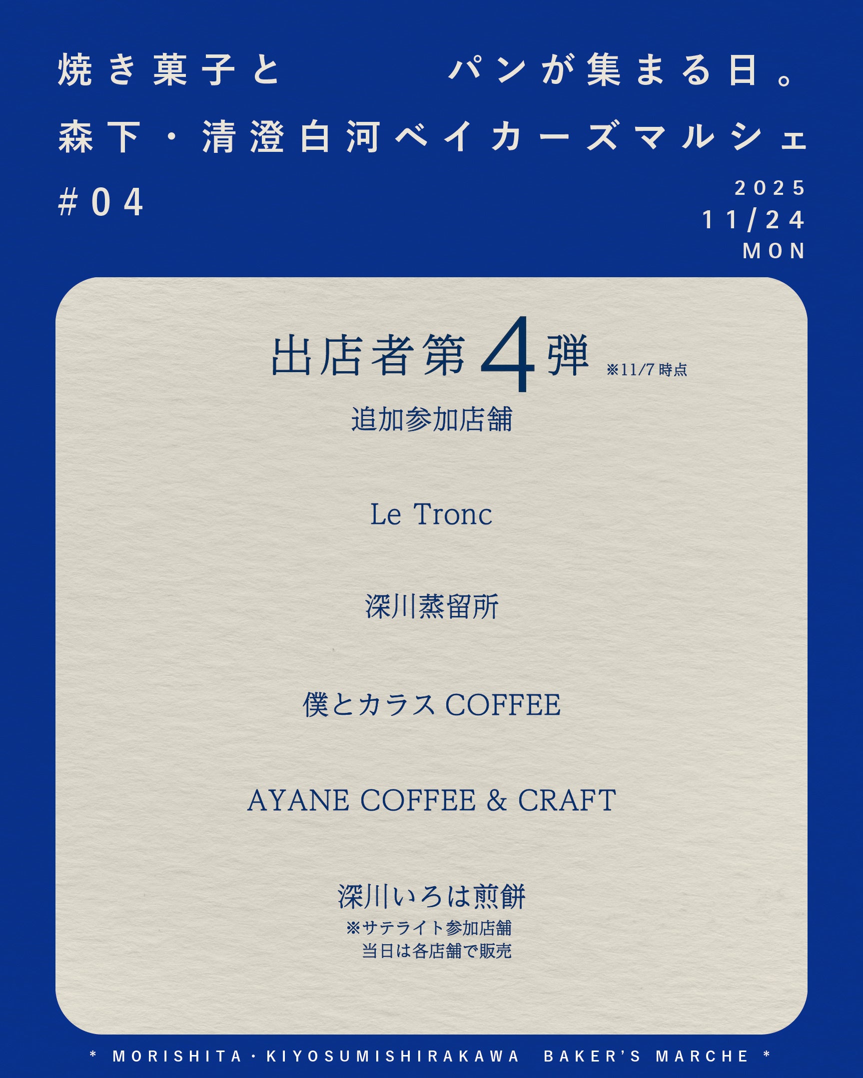 11月24日(月・祝)「焼き菓子とパンが集まる日。」をテーマにした『森下・清澄白河ベイカーズマルシェ』の第4回が開催決定!