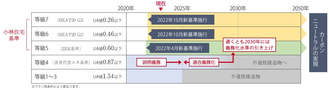2050年のカーボンニュートラル(脱炭素社会)の実現に向けて、住宅の断熱性能の段階的な向上を求め、2022年4月からZEHを基準として断熱等級5が、10月からは新たにZEHを超える新基準として、断熱等級6・7が新設されました。