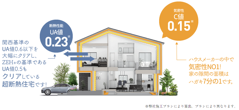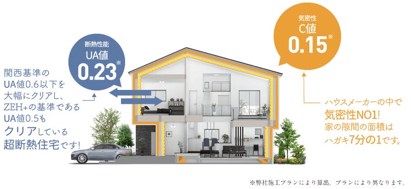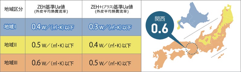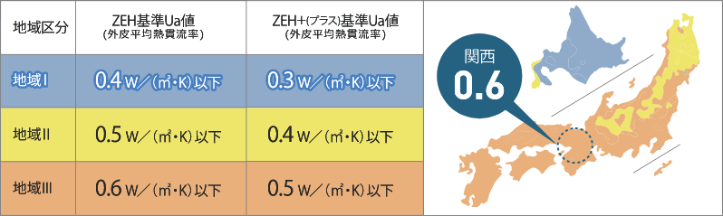 小林住宅のUA値(0.23)は、国の推奨する関西のZEH基準(UA値0.6)はもちろん、さらに厳しい北海道の基準(UA値0.4)もクリアする断熱性能です。