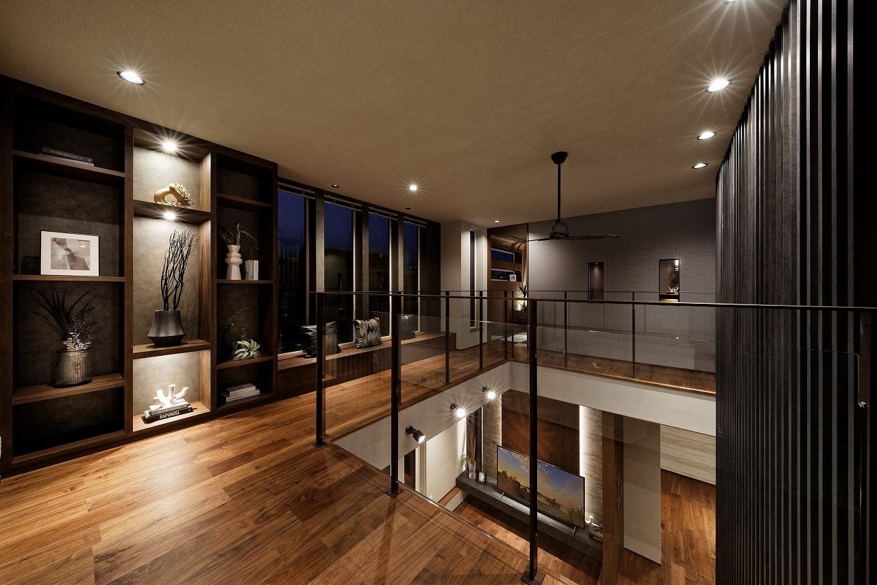 玄関から間仕切りの無い空間を通り、その先には大きな吹抜けで開放感のあるリビング。そこからダイニング・キッチンまで見渡せます。リビング階段を上がると廊下やホールのスペースを活用した、ファミリーライブラリーやヌックがある等、小林住宅の性能を体感していただく為の間取りをご用意しております。