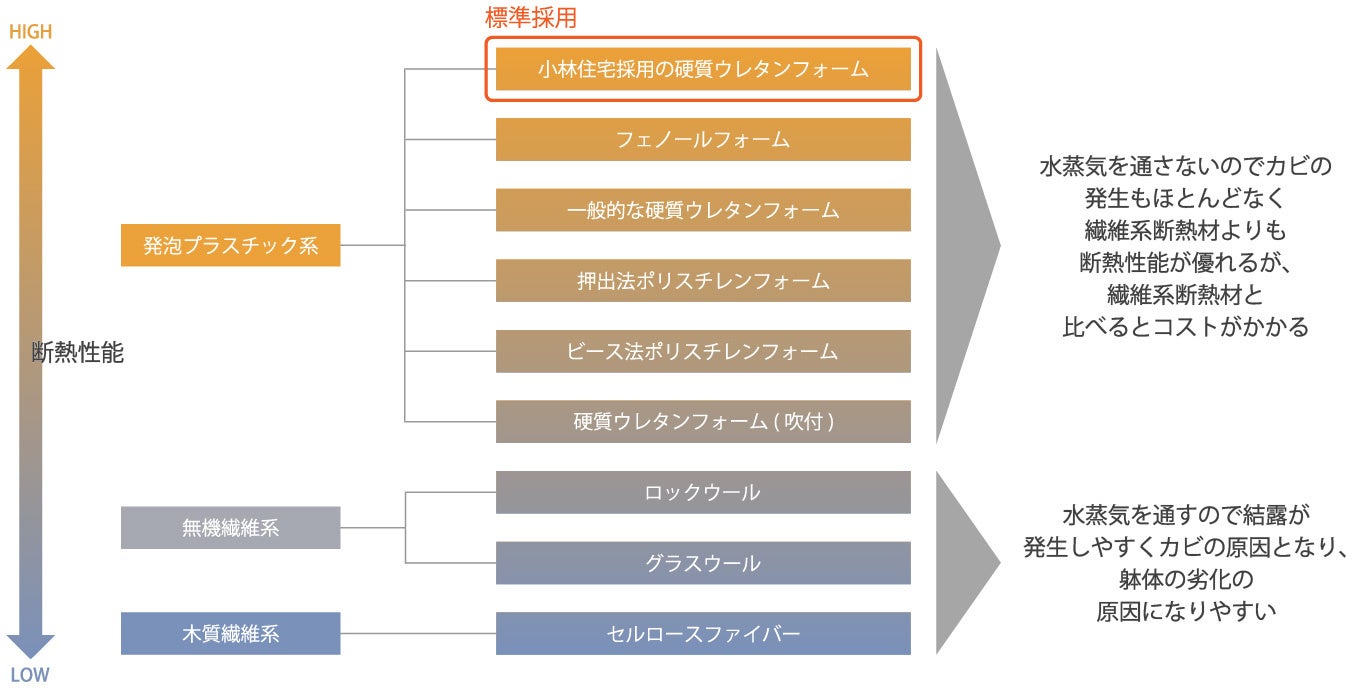 小林住宅は、家の内側と外側に断熱材を施工するダブル断熱工法で「熱と湿気を抑える」超断熱住宅です。