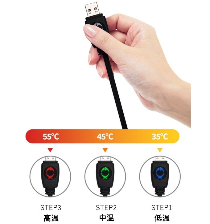 モバイルバッテリー使用することで、55℃まで発熱し、断熱機能と保温効果に優れた素材を使用しています。