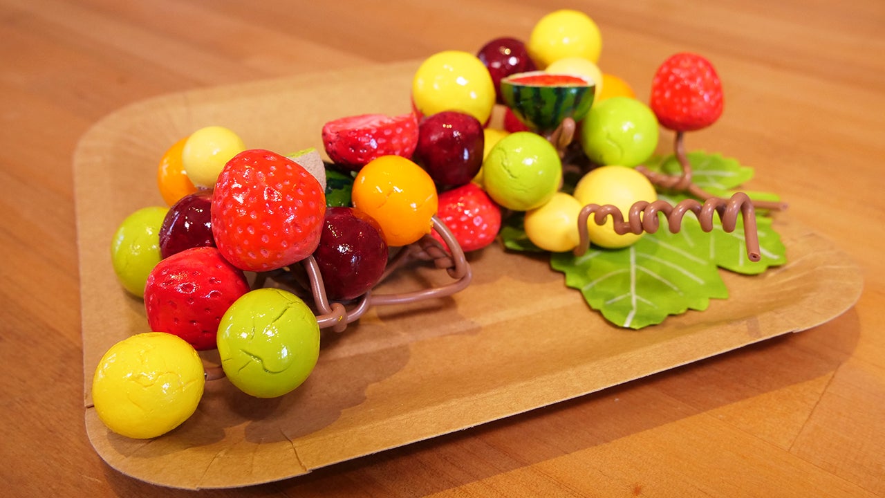 こんな「おもちゃ」、こんな「乗り物」があったらと想像したものを、身近なものを使って工作してもらいます。佐藤蕗先生が想像したのは、色とりどりの果実がブドウのように一つにまとまった「未来のフルーツ」。紙ねんどや絵の具で、かわいく仕上げていただきました。身の回りにあるものの未来の姿を楽しく想像するのがポイントです。