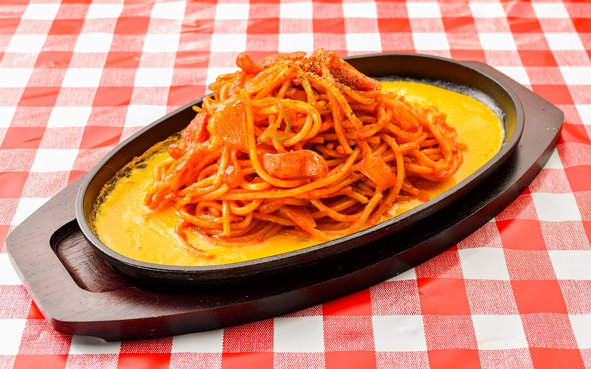 ナポリタンの本場、名古屋にパンチョが初進出。名古屋のみなさま、はじめまして。これがパンチョ自慢の極太ナポリタン、大盛りもトッピングも名古屋限定「鉄板パンチョ」も遠慮なくがっつりいっちゃってください!