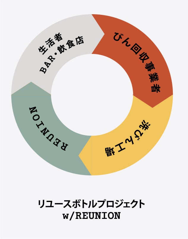 「MAKE IT COLORFUL(人生を楽しさで彩る)」をコンセプトに掲げるREUNIONは、これまでに販売された「REISHI GIN,」の空ボトルに加え、REUNIONがリスペクトする他社ブランドの使用済みボトルを、びん回収事業者や飲食店・BARと連携して回収。集めたボトルは、明治時代より続く洗びん事業者や就労支援事業所にて丁寧に洗浄した後、酒蔵にて品質検査・再充填・ラベリングを経て、「REISHI GIN, w/ REUSED BOTTLE」として再流通させています。
