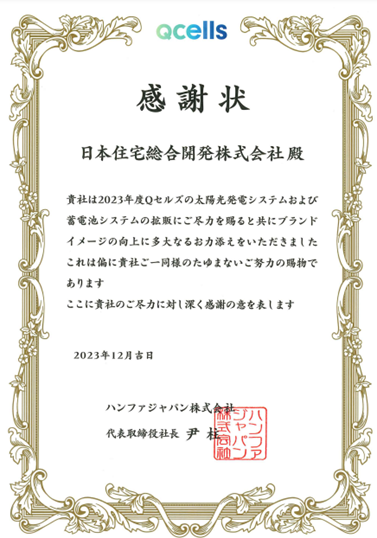 日本住宅総合開発株式会社は、2023年度においてこの度、Qcells様からの太陽光発電システムおよび蓄電池システムの拡販により感謝状を授与いただき、日本住宅総合開発はその誉れに感謝と喜びを共有しております。