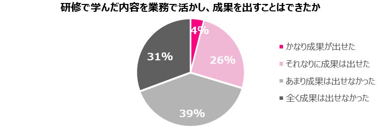 研修で学んだ内容を業務で活かし、さらに成果を出すことができたかの質問については、70%の人があまり、またはほとんど成果を出せなかったと回答しました。多くの人が業務で成果を出せた実感を得るまでには至っていないことが読み取れます。