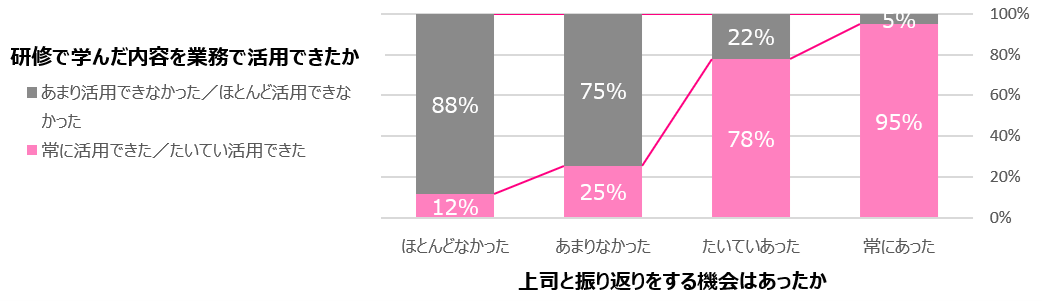研修後に上司と振り返る機会があった頻度と、研修で学んだ内容の業務活用度の関係性を調べると、上司と振り返る機会があったと答えた人の方が業務で活用できたと答える割合が高い傾向がありました。