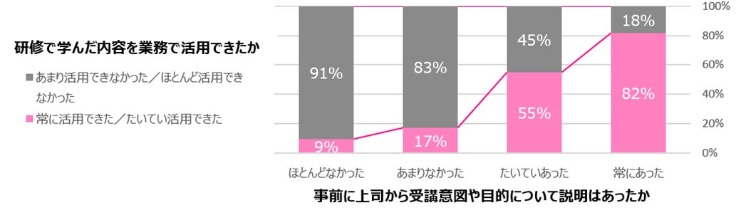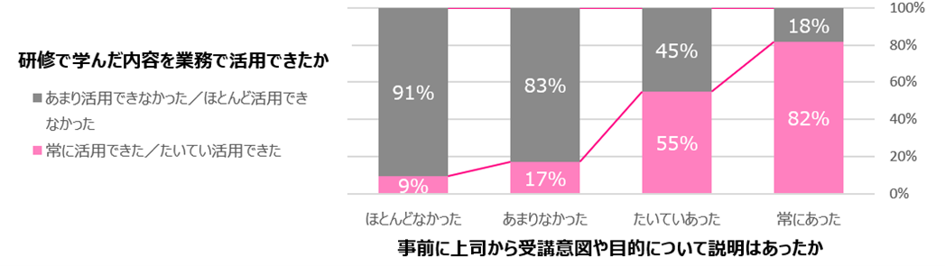 事前に上司から説明のあった頻度と、研修で学んだ内容の業務活用度の関係性を調べると、事前の説明があったと答えた人の方が業務で活用できたと答える割合が高い傾向がありました。