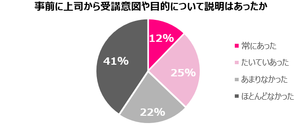 研修前の取り組みを聞くと、上司から受講意図や目的の説明があったのは37%