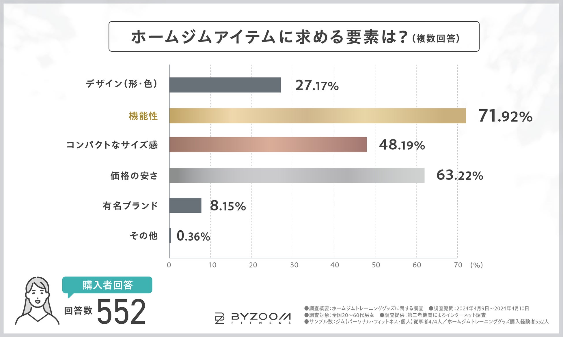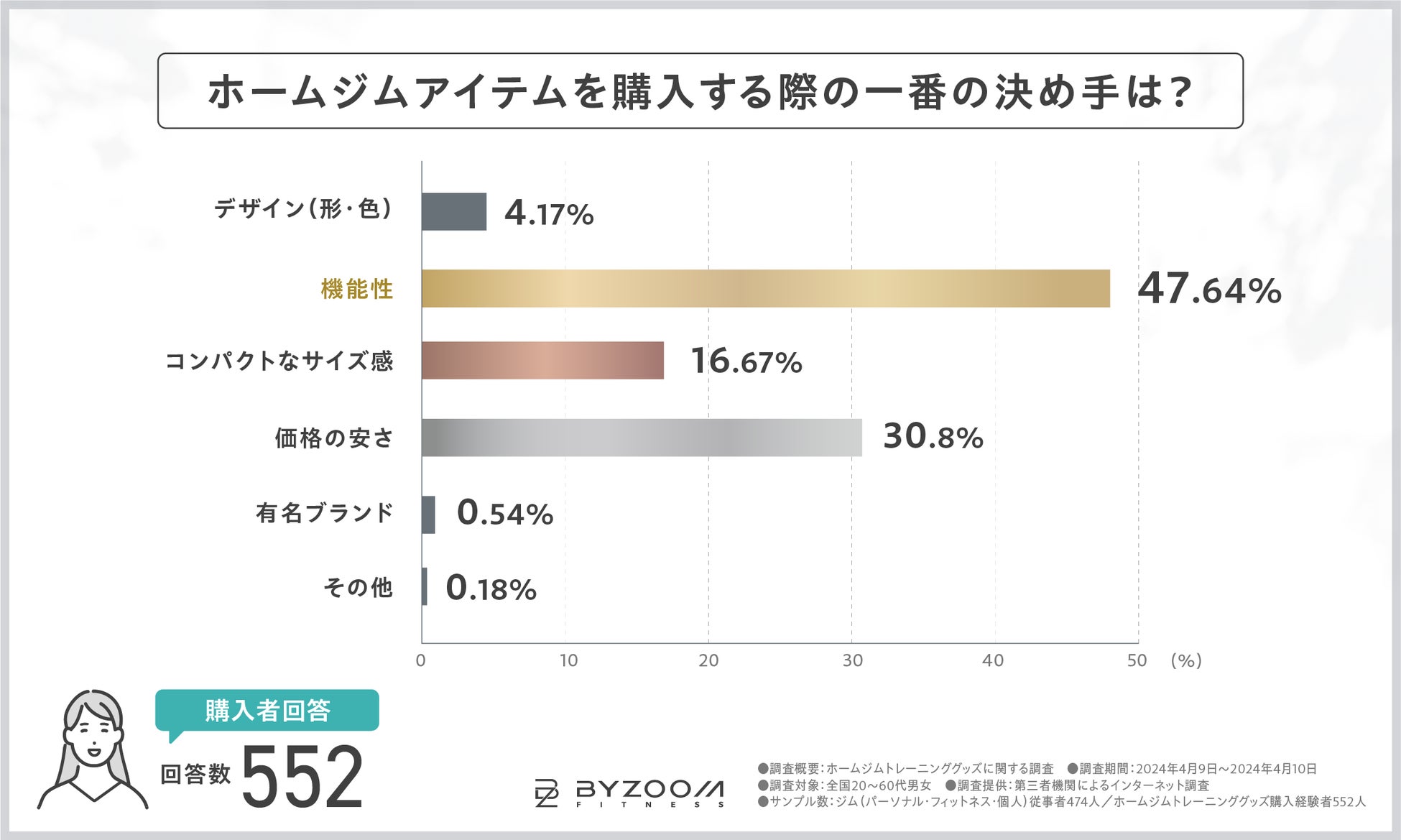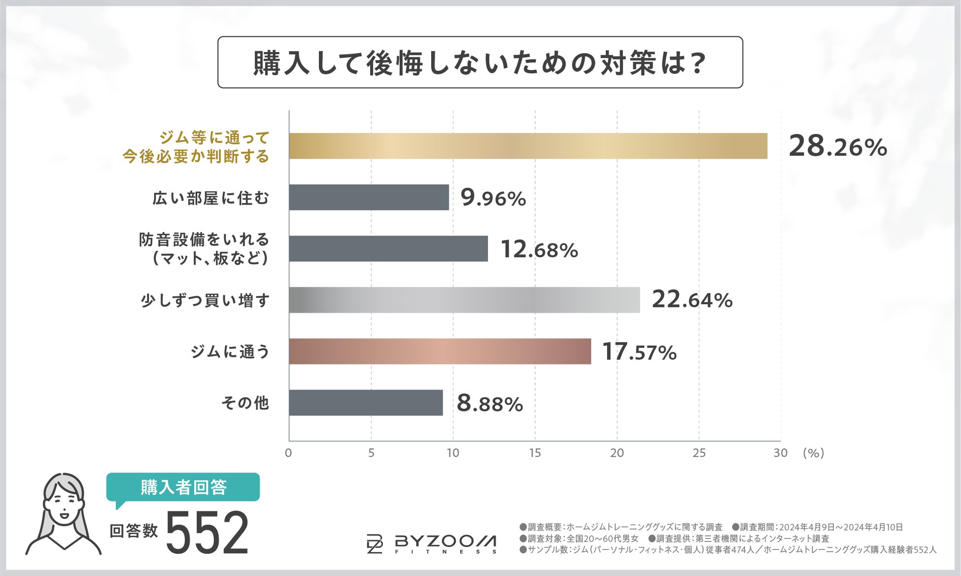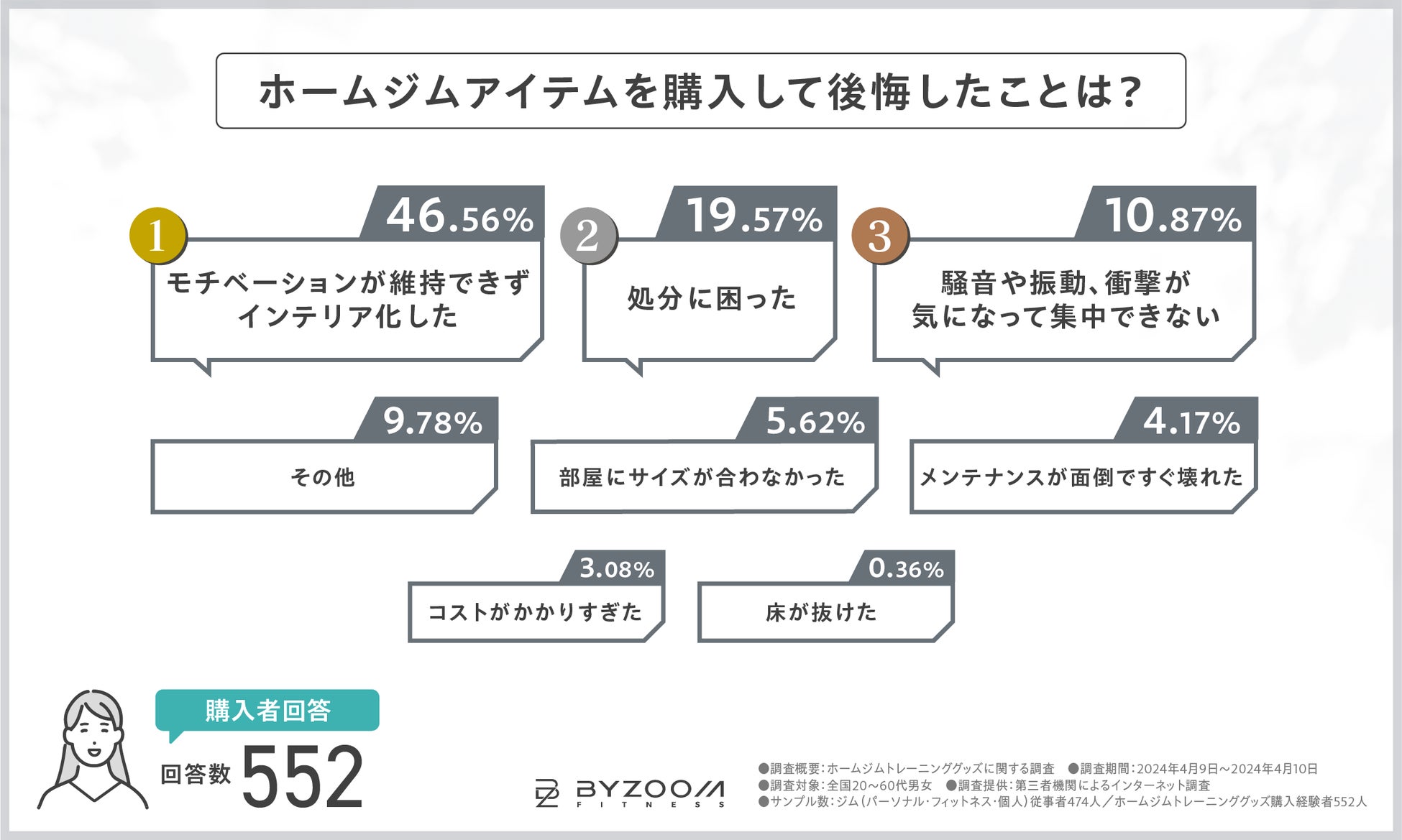 ホームフィットネスブランドとして世界中で愛される「アジャスタブルダンベル」をはじめとするホームジムグッズを取り扱う『BYZOOM FITNESS JAPAN』は、ホームジムグッズ購入者を対象に、ホームジムグッズの”購入の決め手や失敗経験”などに関する調査を実施しました。