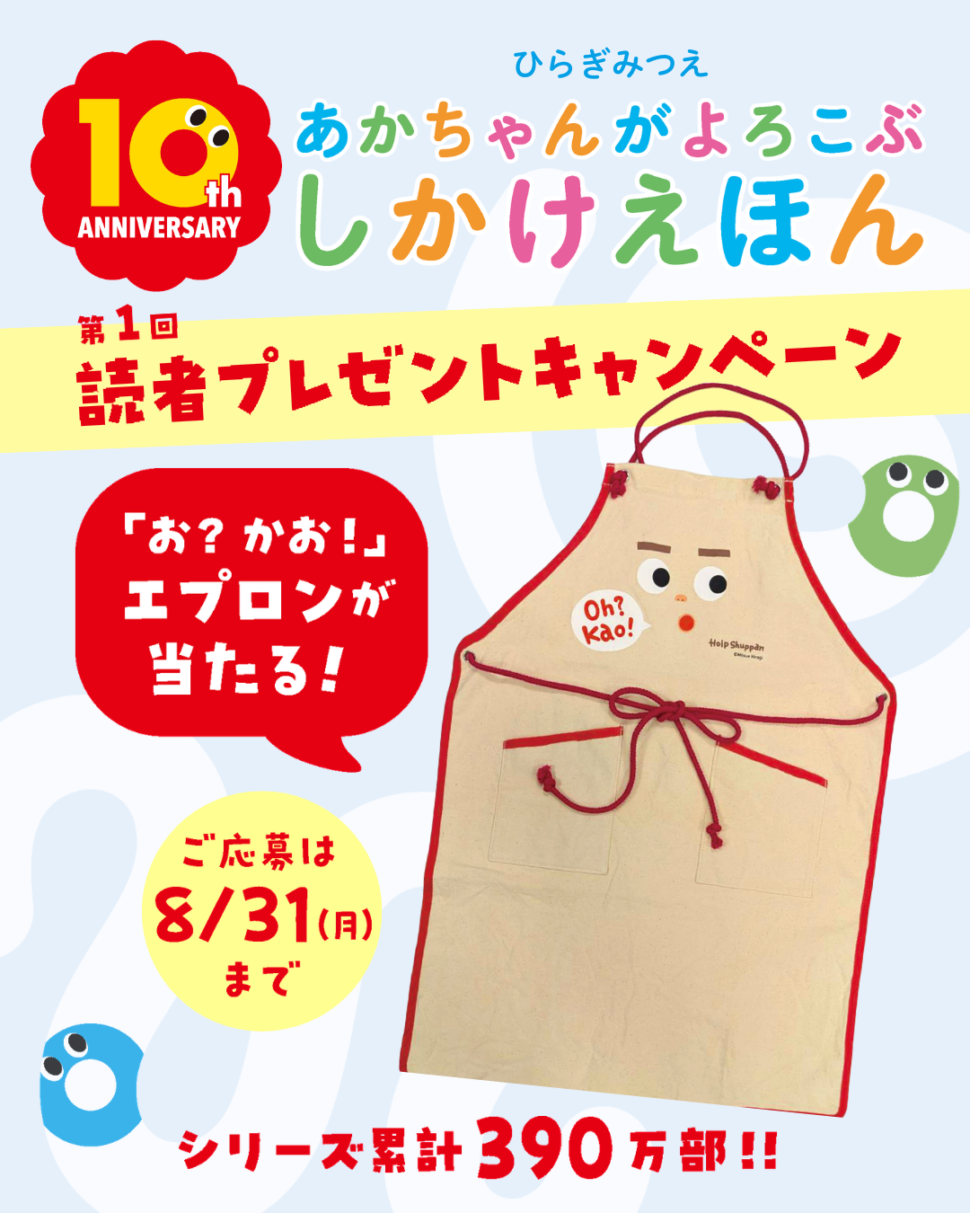 『お?かお!』のイラスト入りエプロンが当たるキャンペーンを、5月上旬より開催します。あかちゃんがよろこぶしかけえほん特設サイト、または、フェア開催書店で配布の「あかちゃんがよろこぶしかけえほん10周年記念シール」のQRコードから応募してください。抽選で100名に、『お?かお!』エプロンをプレゼントします。