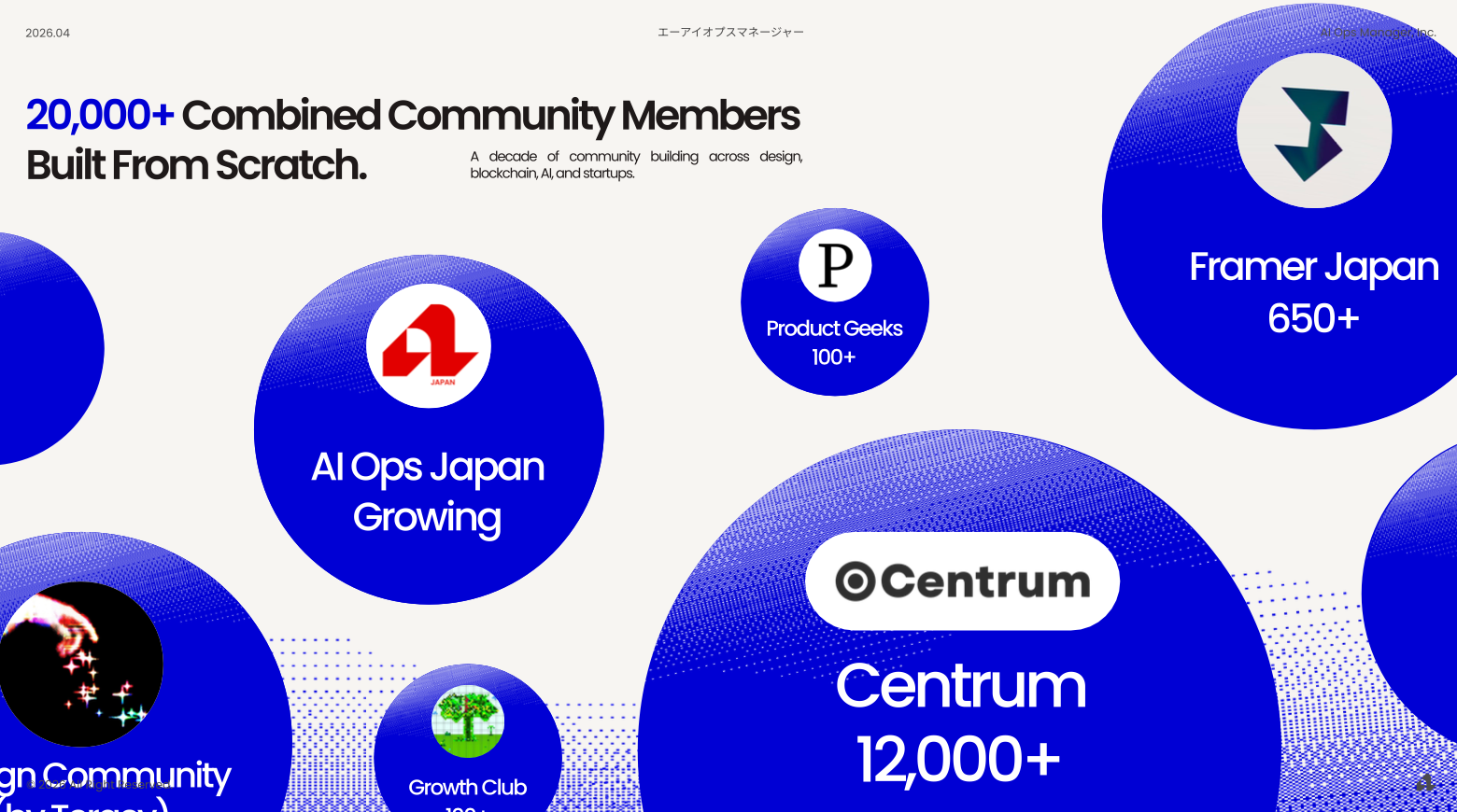 Community × Talent × Execution の3機能を提供。300名超のAIスペシャリストネットワークと2万名超のコミュニティ群を背景に、最短30日での日本市場ローンチを支援。